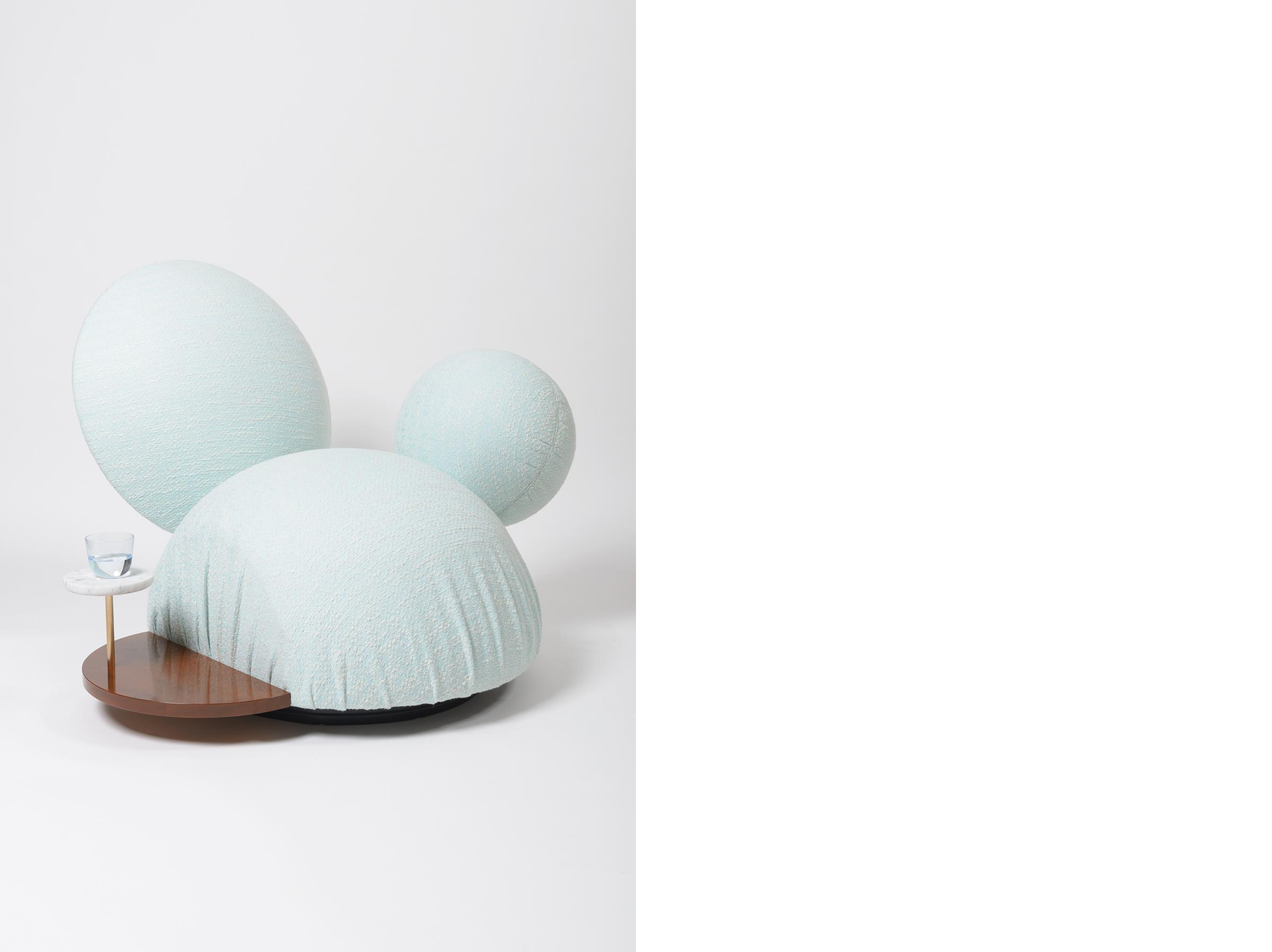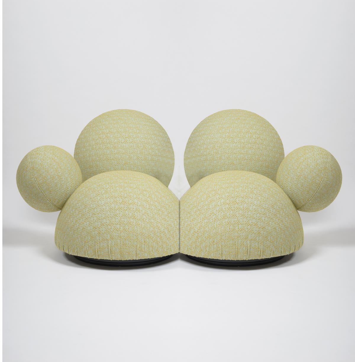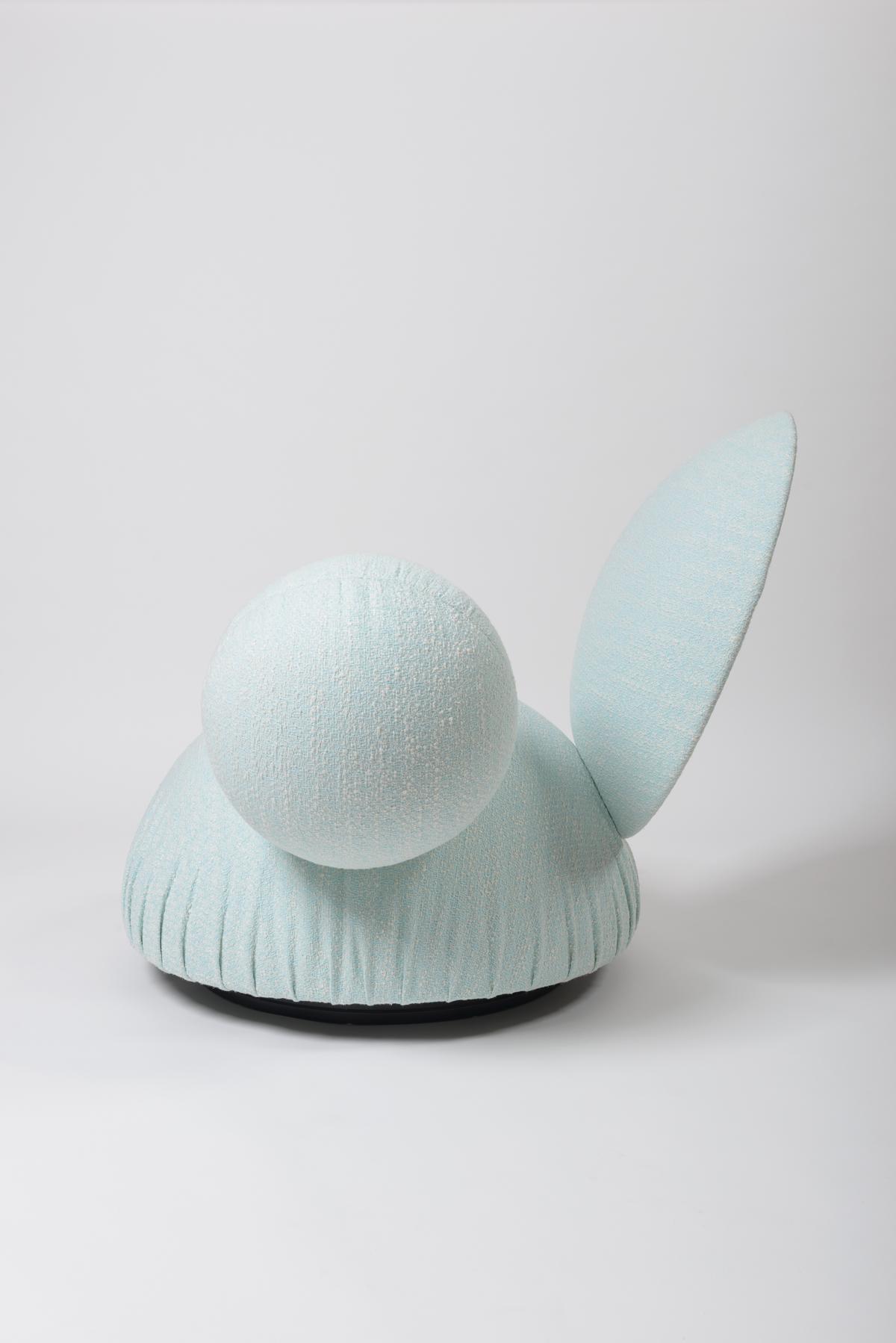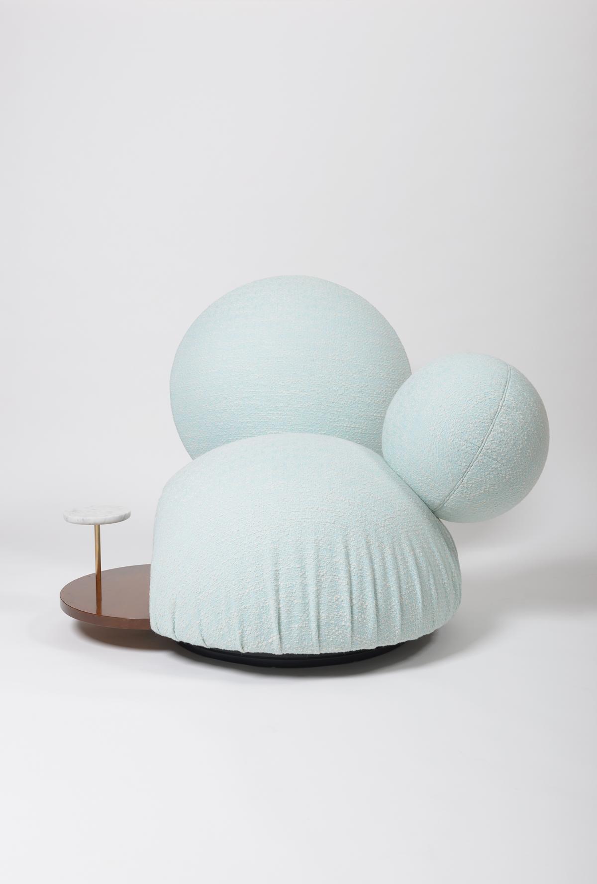 A straight cut through the larger of the two spherical bodies creates a hemispherical seat cushion and a spherical cap as a backrest. The seat cushion appears to "float" above the floor and can be rotated by 360° in all directions thanks to a central rotating mechanism.
