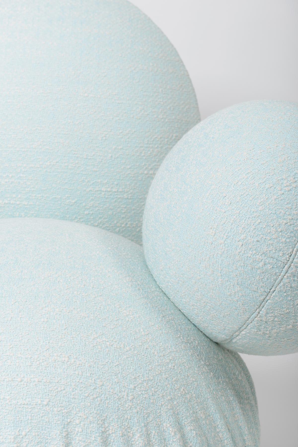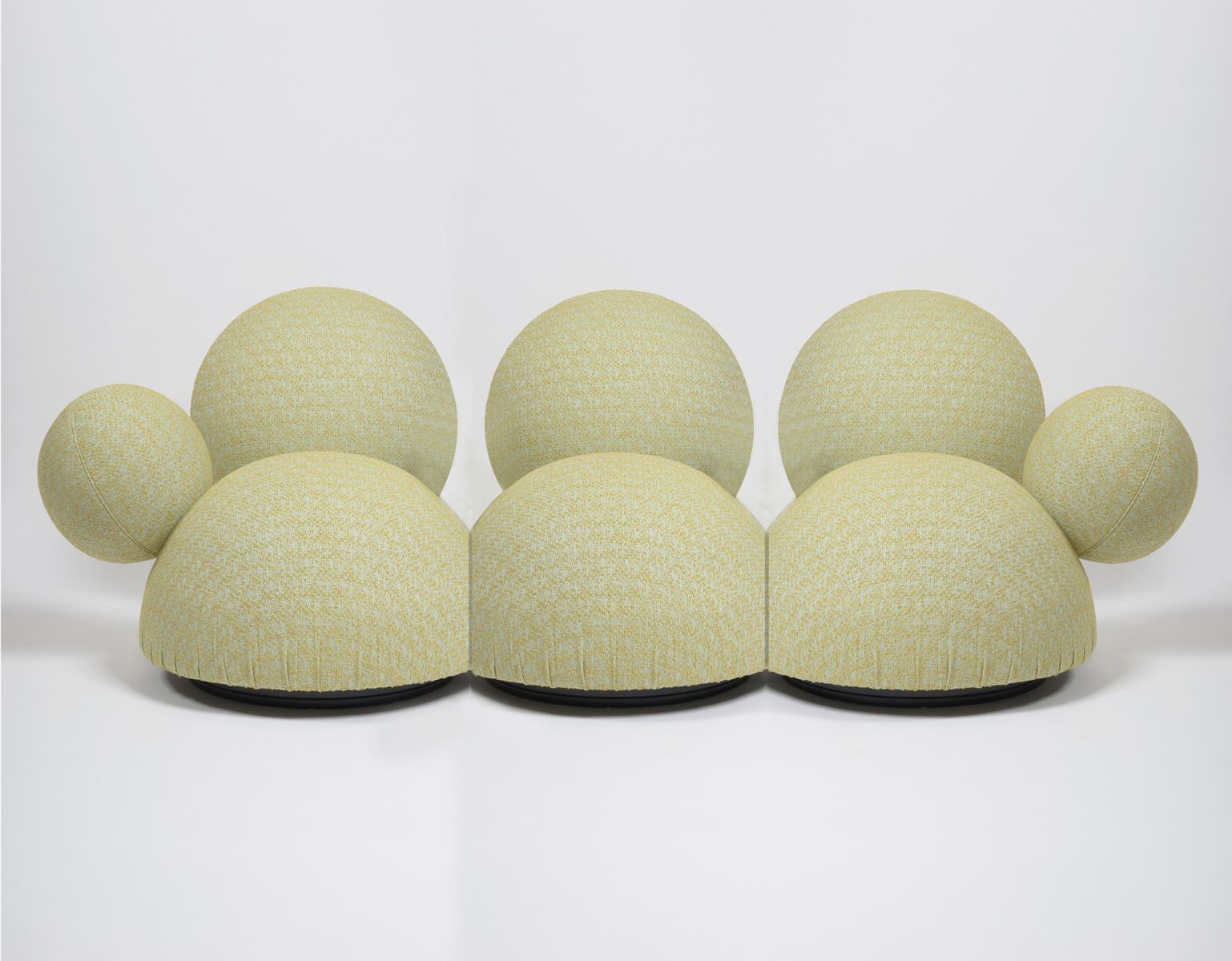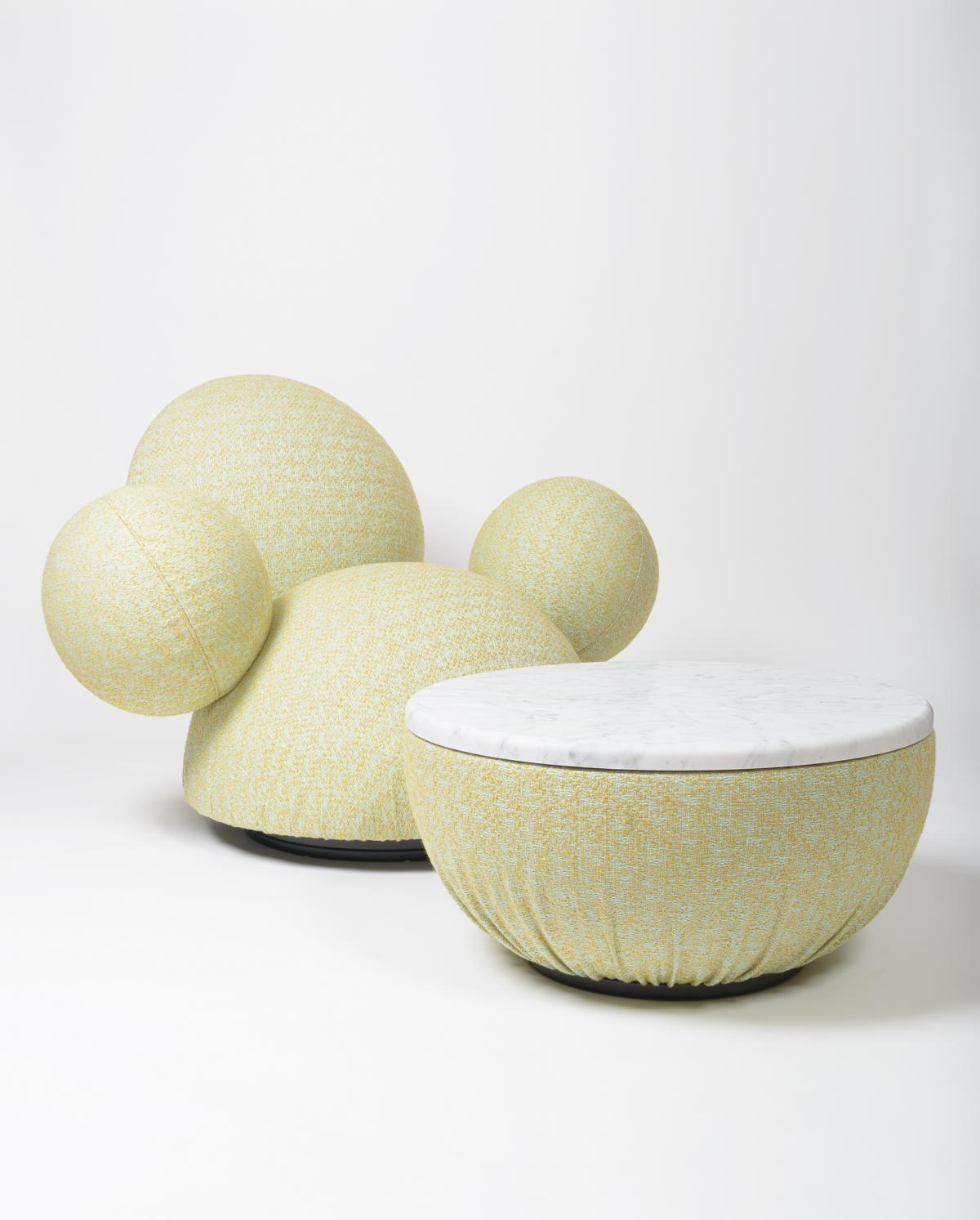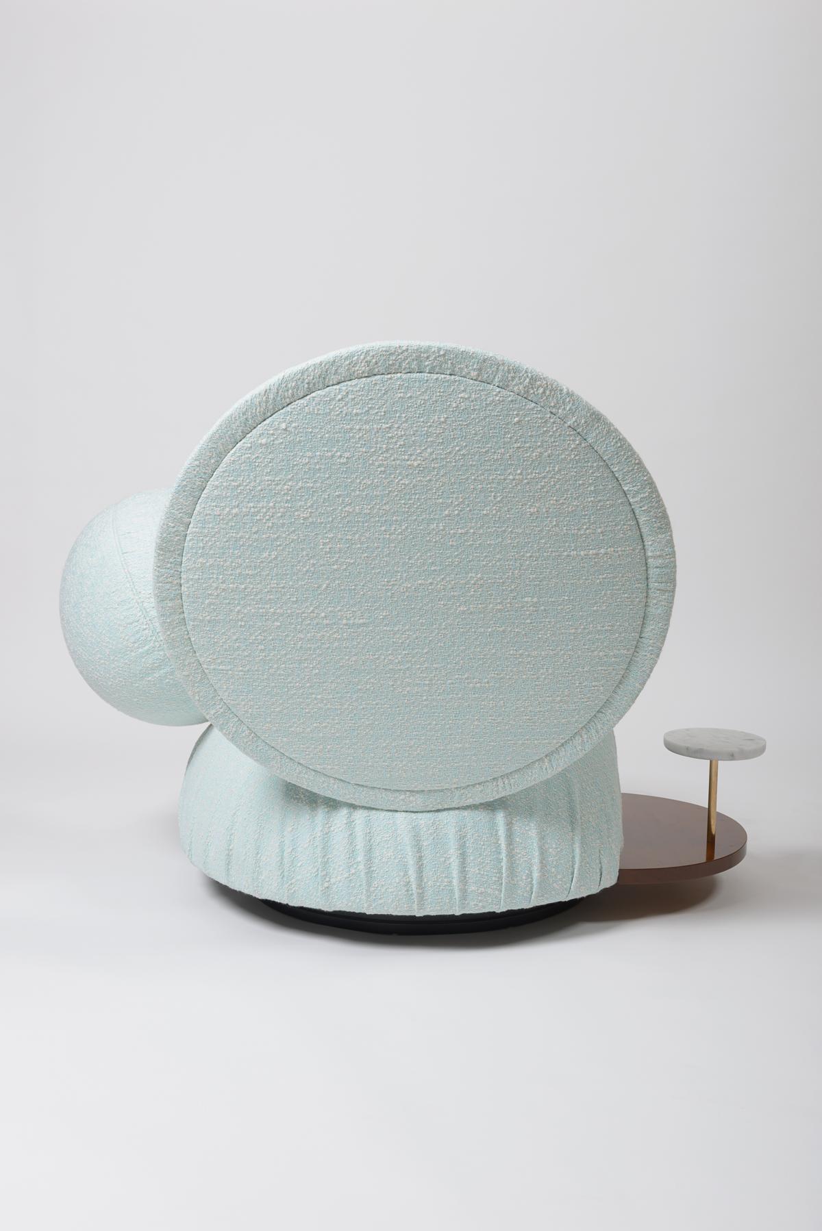 A straight cut through the larger of the two spherical bodies creates a hemispherical seat cushion and a spherical cap as a backrest. The seat cushion appears to "float" above the floor and can be rotated by 360° in all directions thanks to a central rotating mechanism.