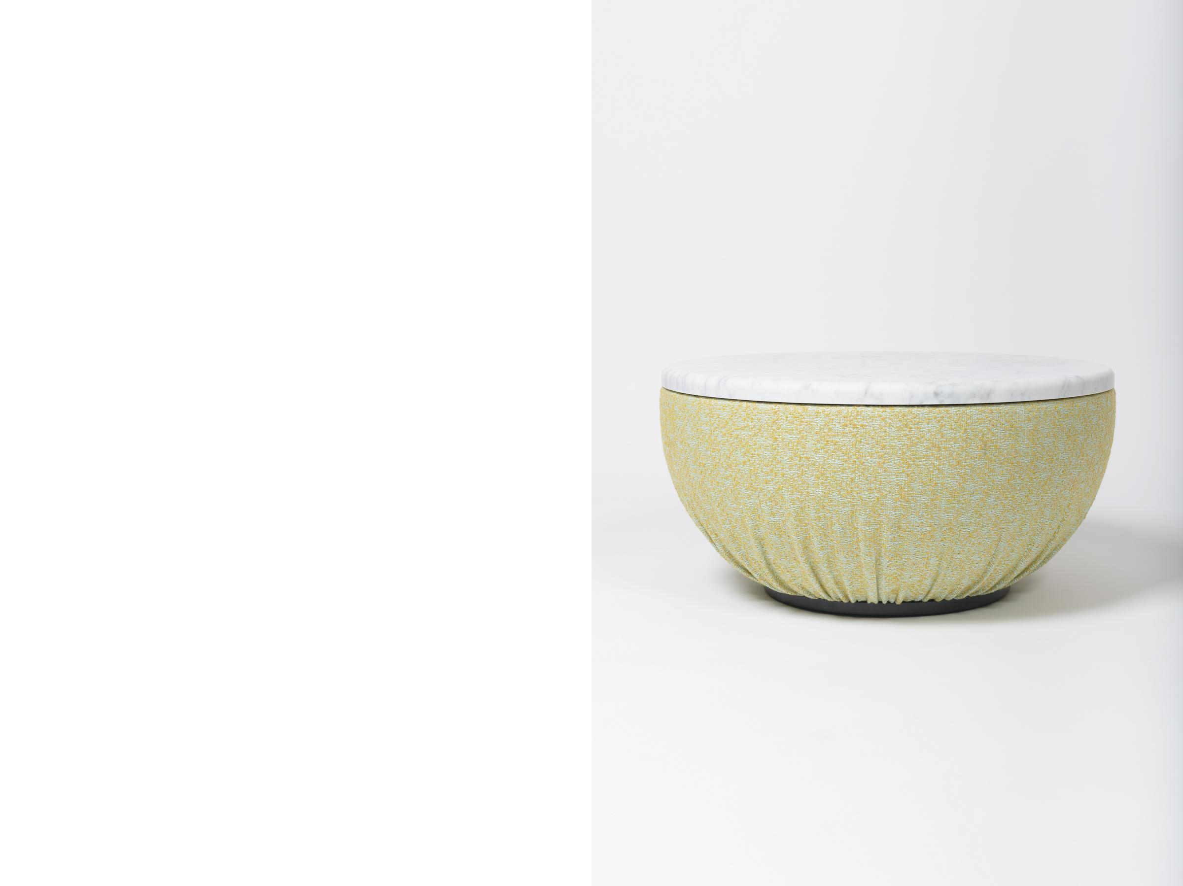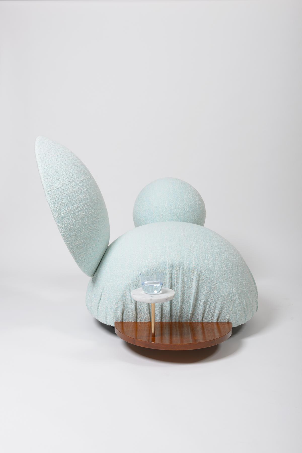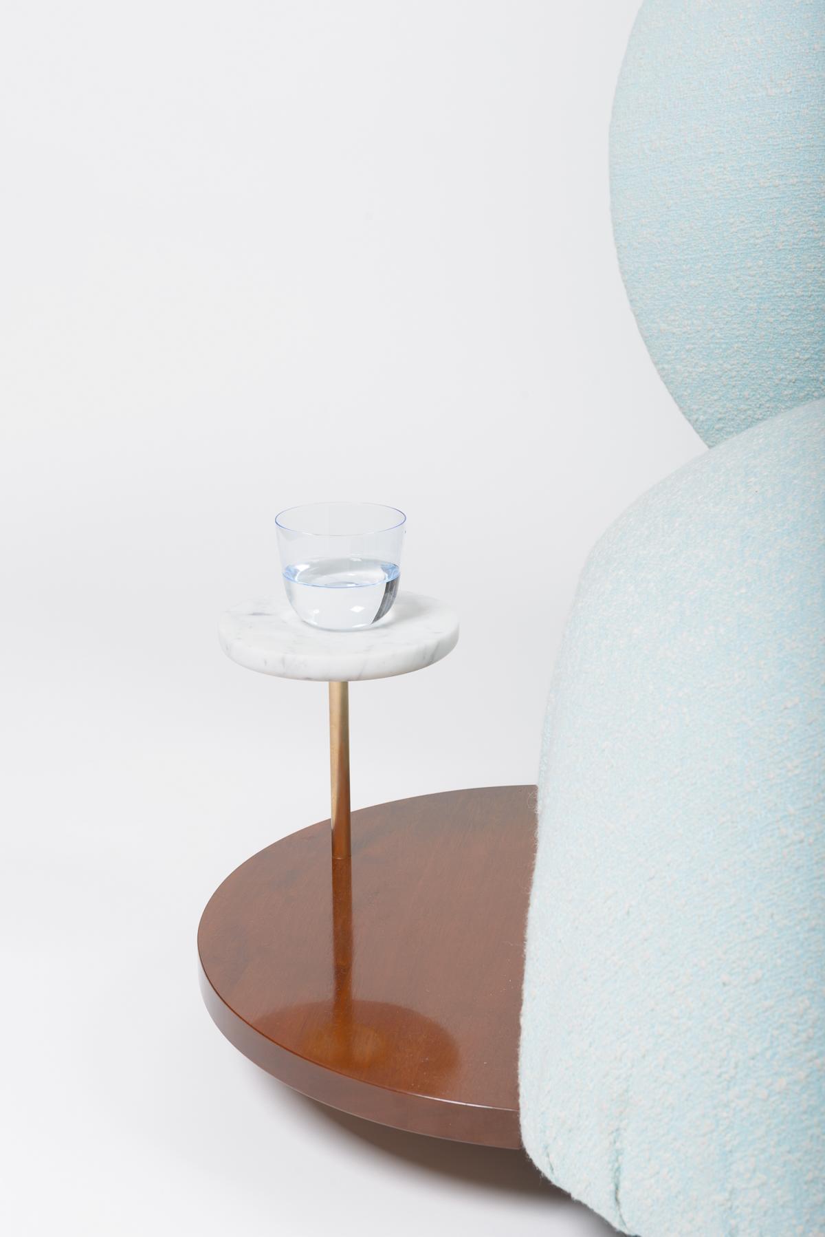 The second part, the backrest, is "leaned" against the seat and is invisibly connected. The smaller spherical body becomes an "armrest" and thanks to its asymmetrical position, also allows other unusual seating positions. A small table and a raised shelf expand the space available in this unusual piece of furniture.